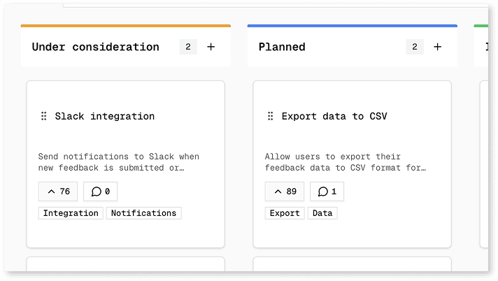 Show what's planned, in progress, and shipped. Drag-and-drop Kanban view keeps everyone aligned and reduces support tickets.