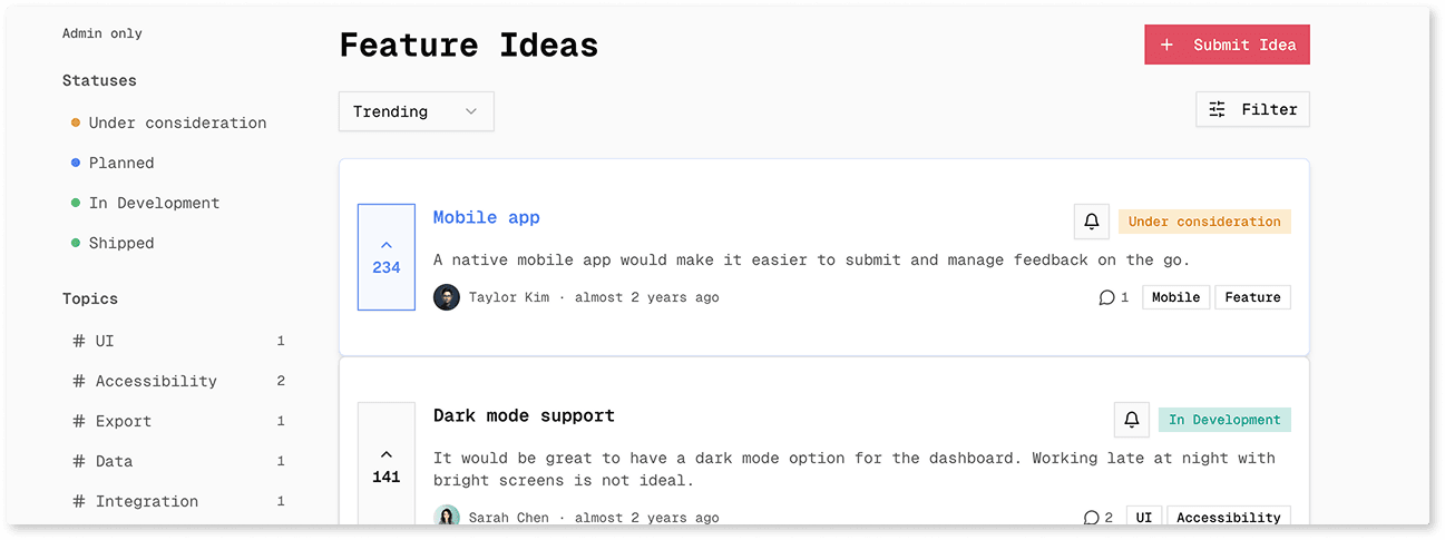 Sort by votes, filter by status, and see what's trending. Stop debating, start shipping what users actually want.