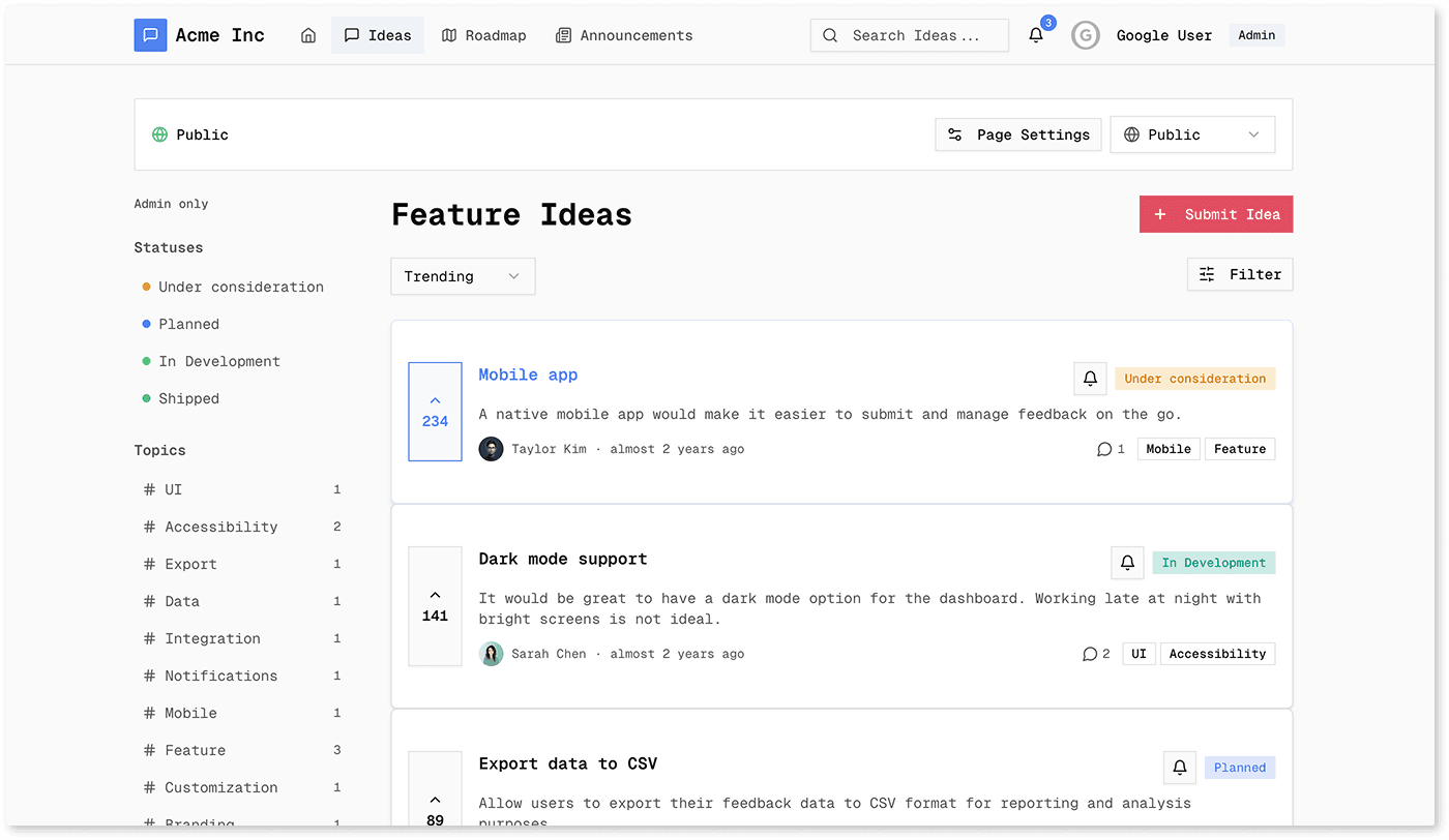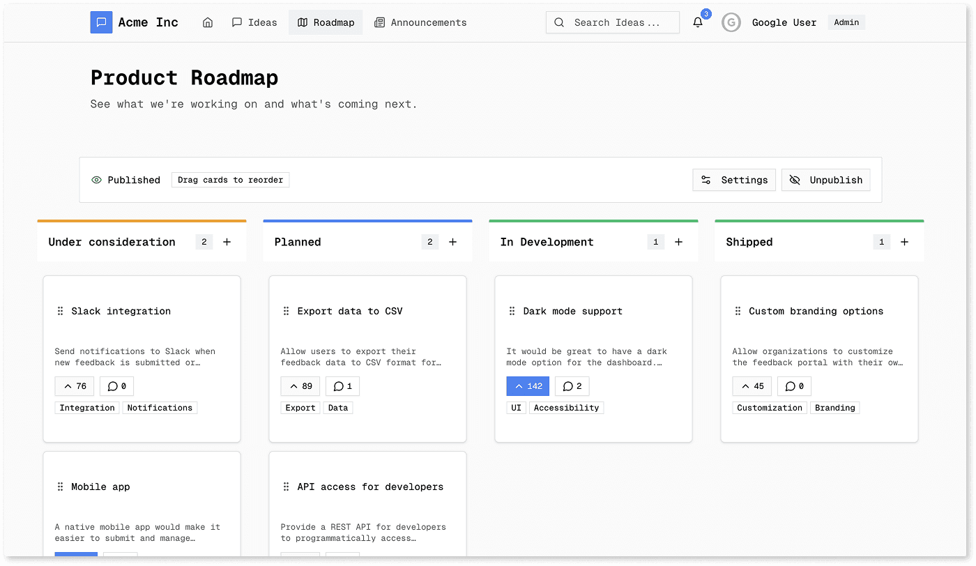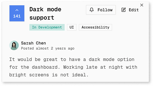 Let customers submit ideas and vote on what matters. Embed in your app, share a link, or use our widget. Guest voting enabled. No login required.